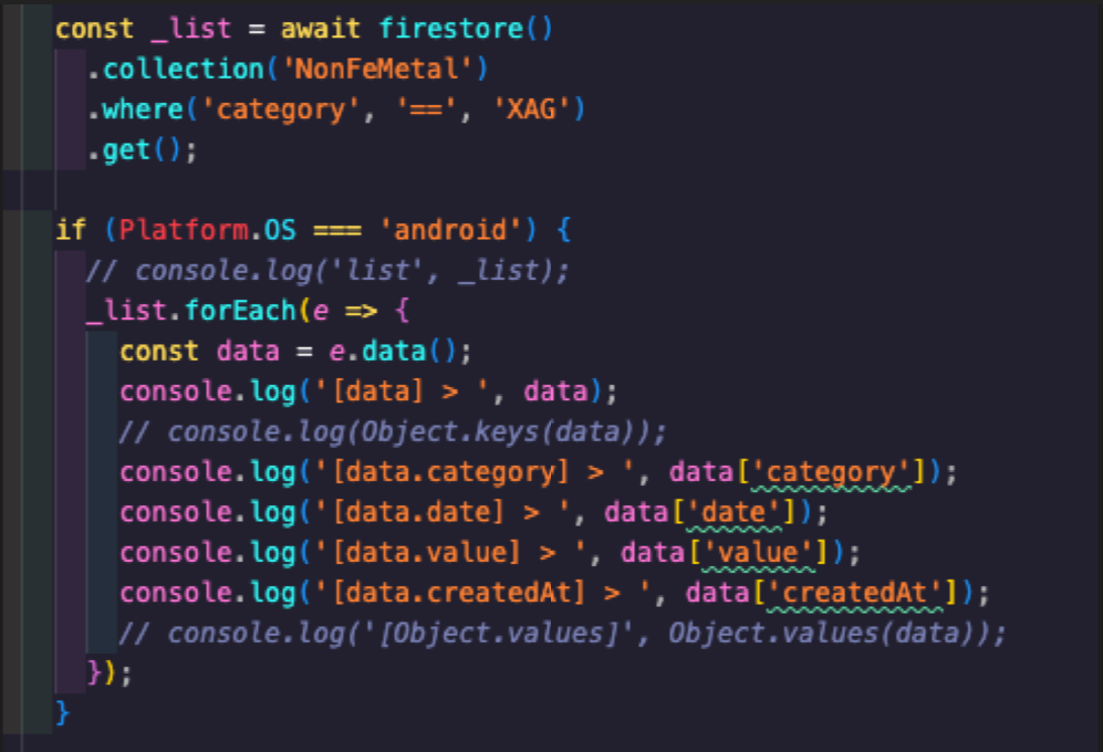 1. firebase로 얻어온 비철의 데이터중 date를 가져오는것이 있는데 나머지 요소를 모두 가져올 수 있지만 오직 date만 가져오지 못한다..!!! 2. 작성한 코드